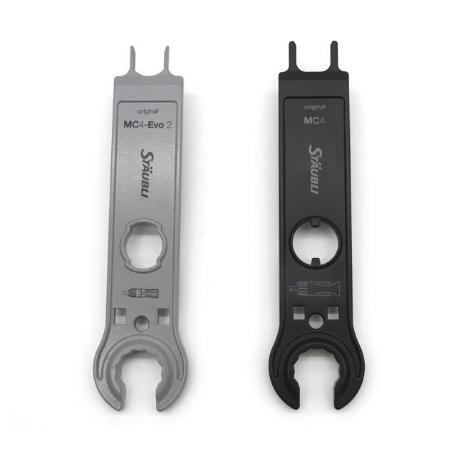The Staubli 32.6058 open-end spanner set is used in photovoltaic installations to tighten and loosen the threaded cap nuts on MC4 and MC4-Evo 2 connectors and to release locked plug-in connections during maintenance or system reconfiguration. It is an essential tool for professional PV installers and service technicians.
